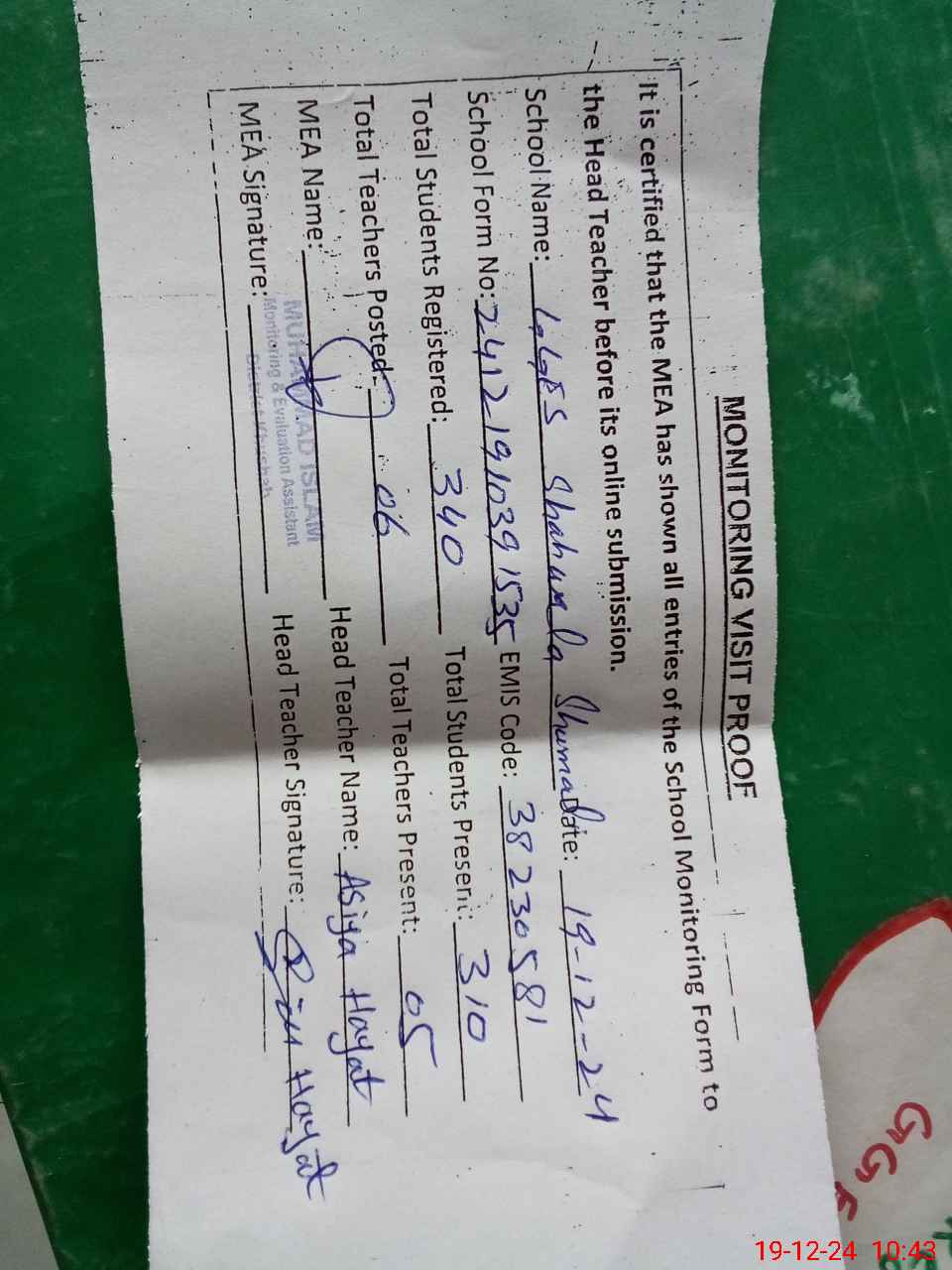 | Certified that this School was Inspected by the Undersigned MEA/DMO Today and the Information Stated Above is as Per Record. | |||||