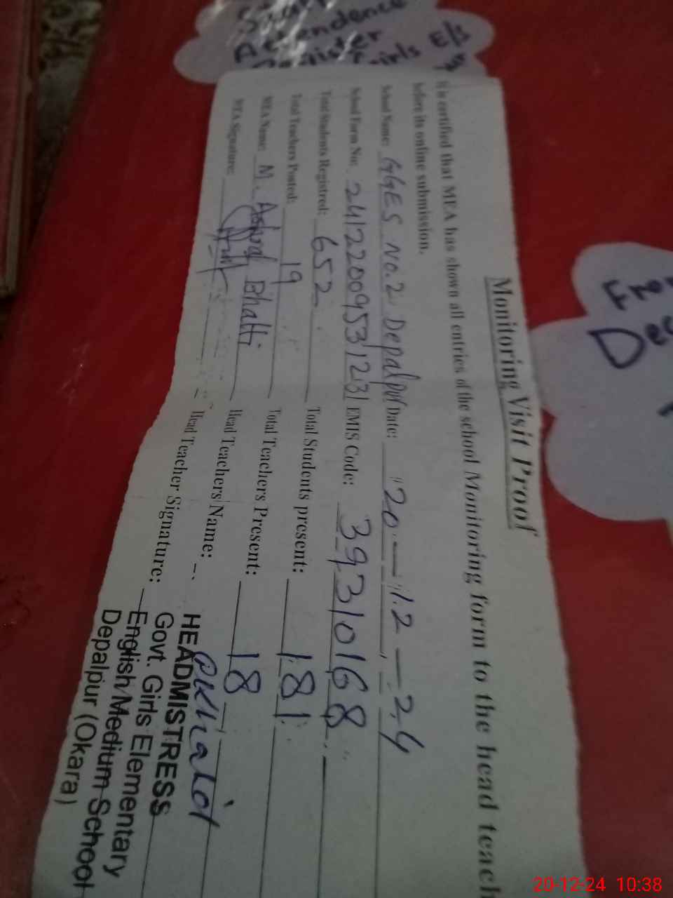 | Certified that this School was Inspected by the Undersigned MEA/DMO Today and the Information Stated Above is as Per Record. | |||||