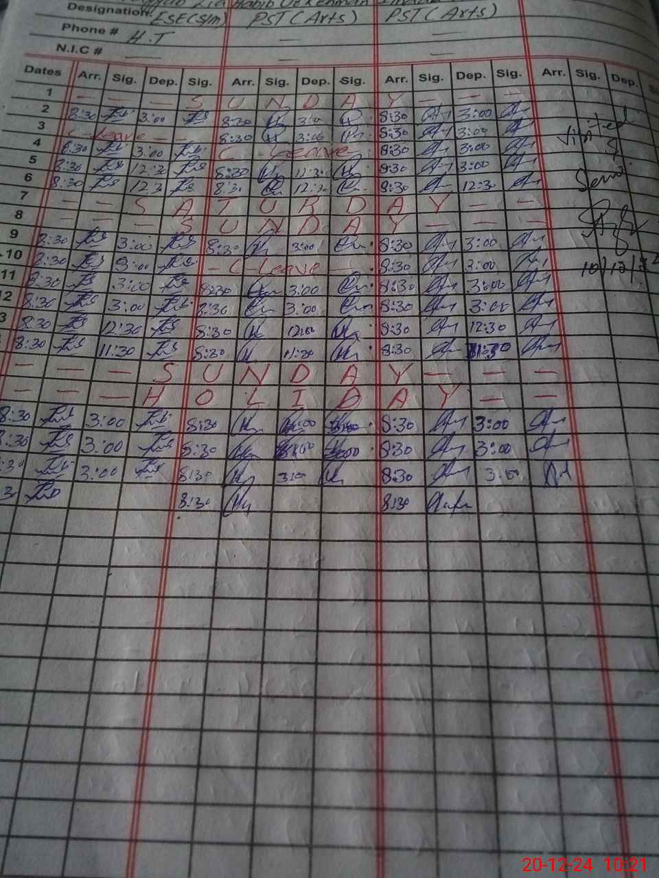 | CNIC | Full Name | Designation | R/C | Absence During Last Calender Month |