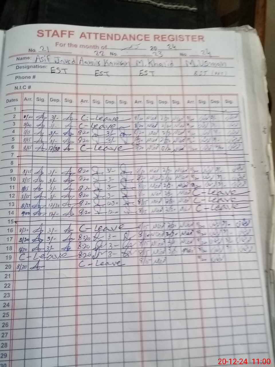 | CNIC | Full Name | Designation | R/C | Absence during last cal. month |