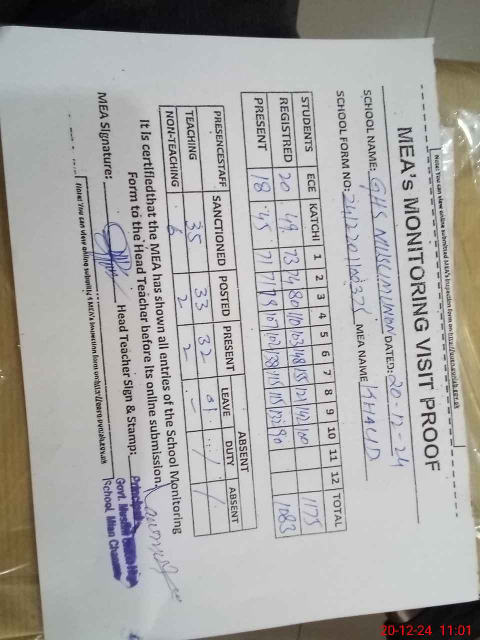 | Attendance Register | Head Teacher | MEA with School | Visit Proof |