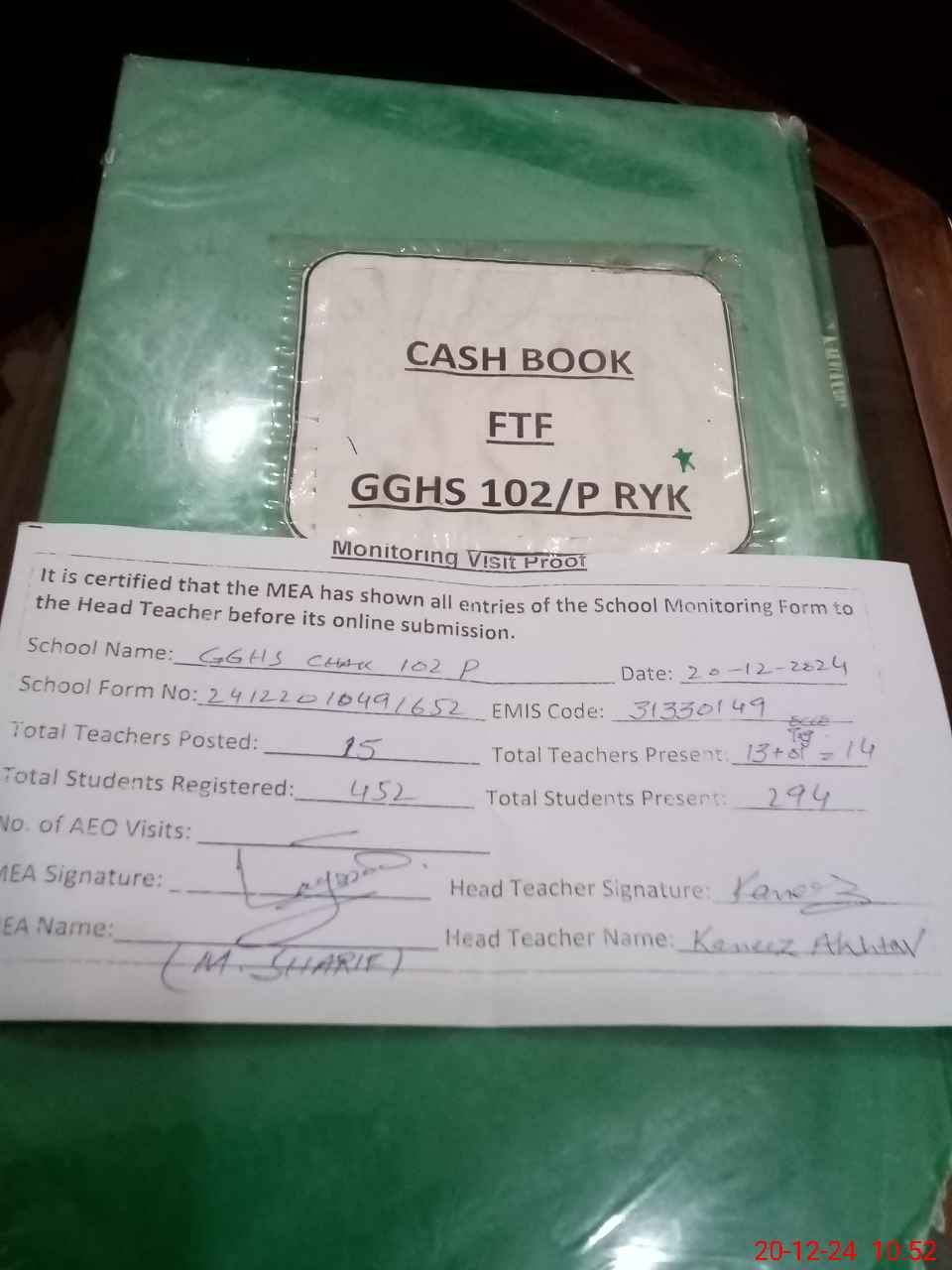 | Attendance Register | Head Teacher | MEA with School | Visit Proof |
