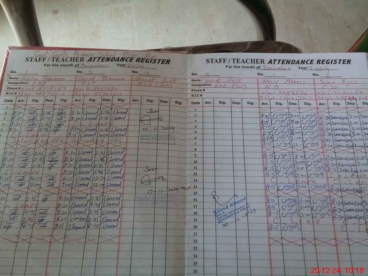 | CNIC | Full Name | Designation | R/C | Absence during last cal. month |