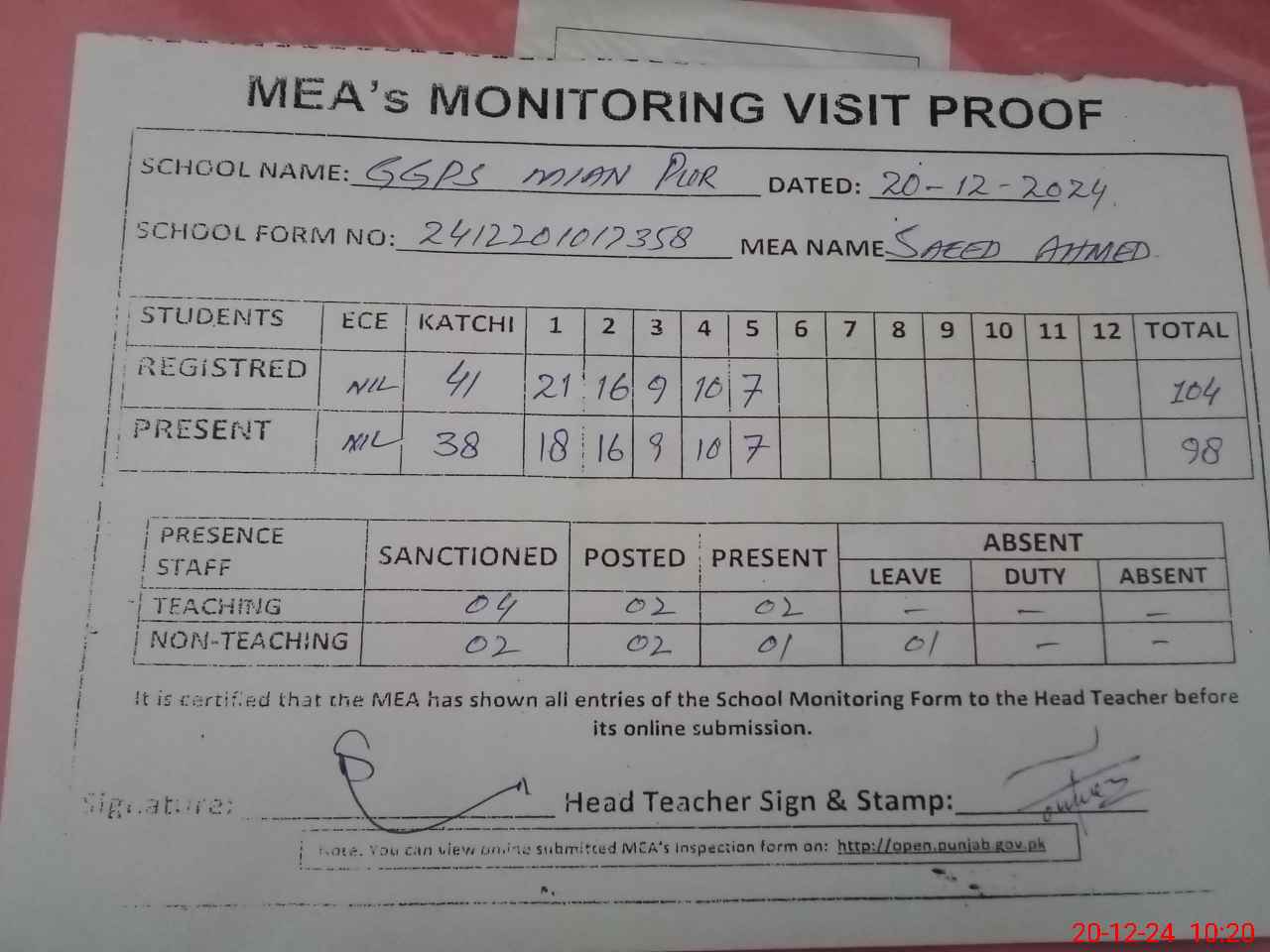 | Attendance Register | Head Teacher | MEA with School | Visit Proof |