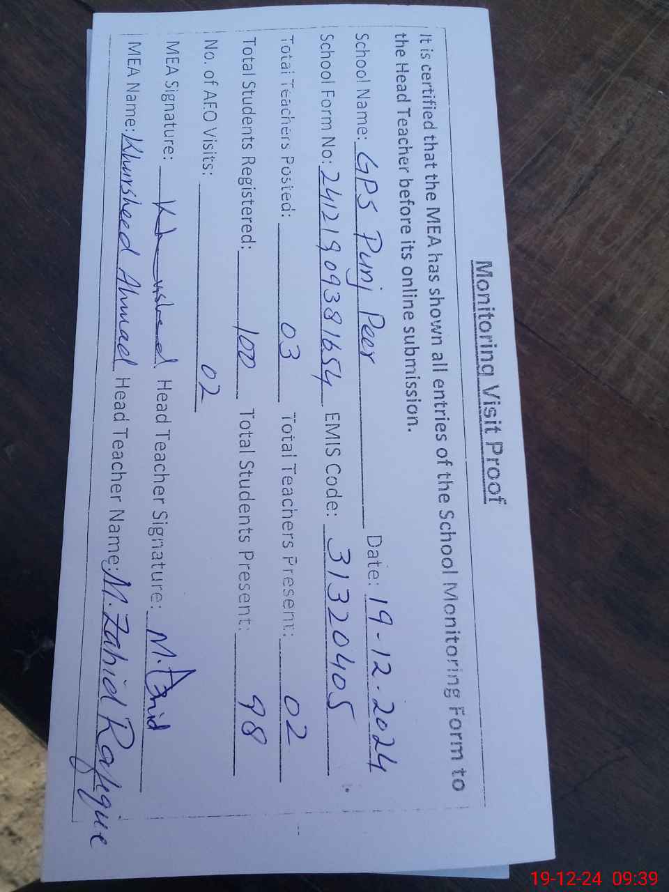 | EMIS Code: 31320405 | Name of School: GPS PUNJ PEER | |||