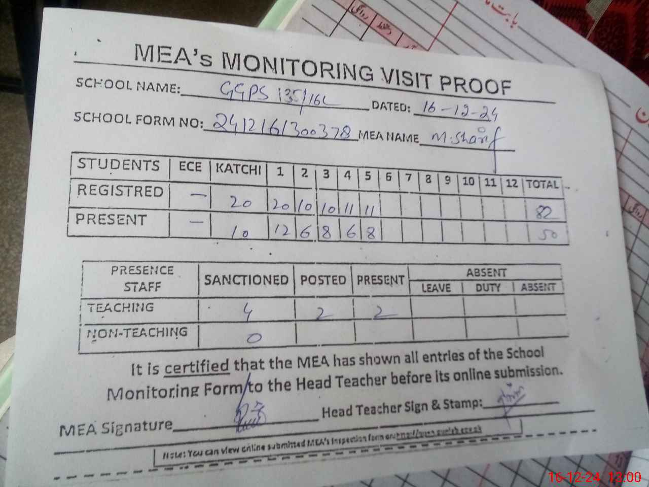| Attendance Register | Head Teacher | MEA with School | Visit Proof |