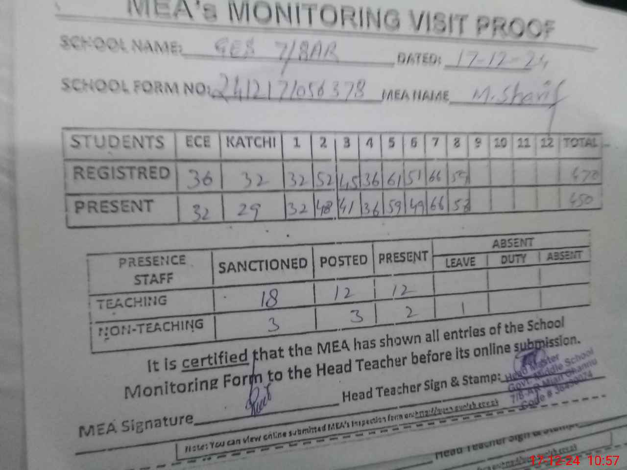 | Attendance Register | Head Teacher | MEA with School | Visit Proof |