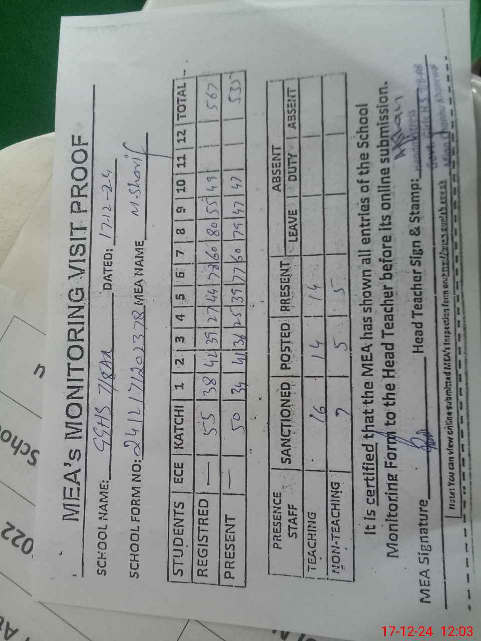 | Attendance Register | Head Teacher | MEA with School | Visit Proof |