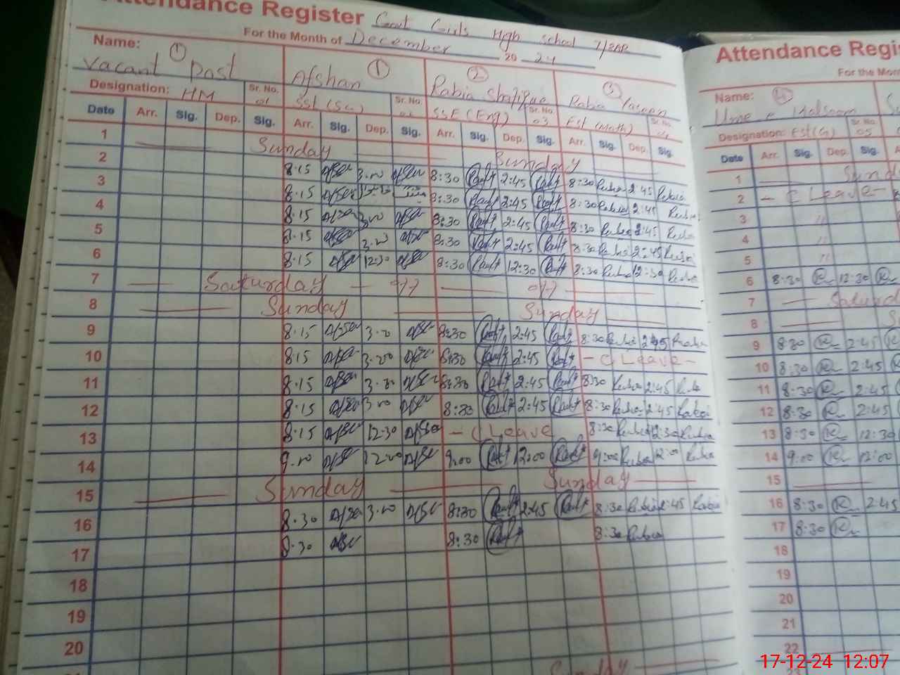 | CNIC | Full Name | Designation | R/C | Absence During Last Calender Month |