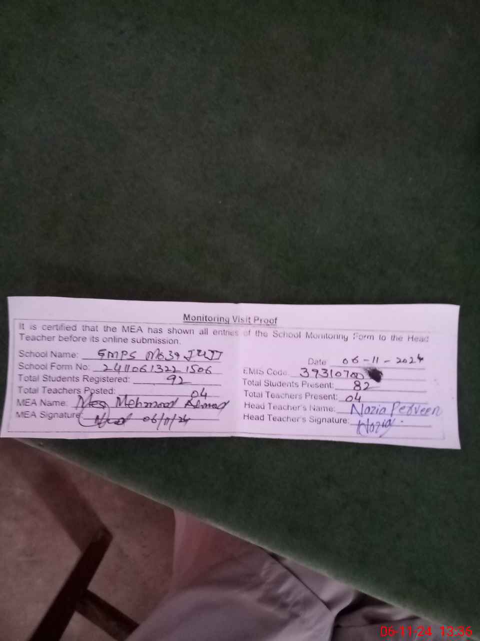 | Monitoring Date: 06-11-2024 | Start Time: 06-11-2024 01:22 PM | End Time: 06-11-2024 01:36 PM | Name of MEA: ME**** AH**** | |