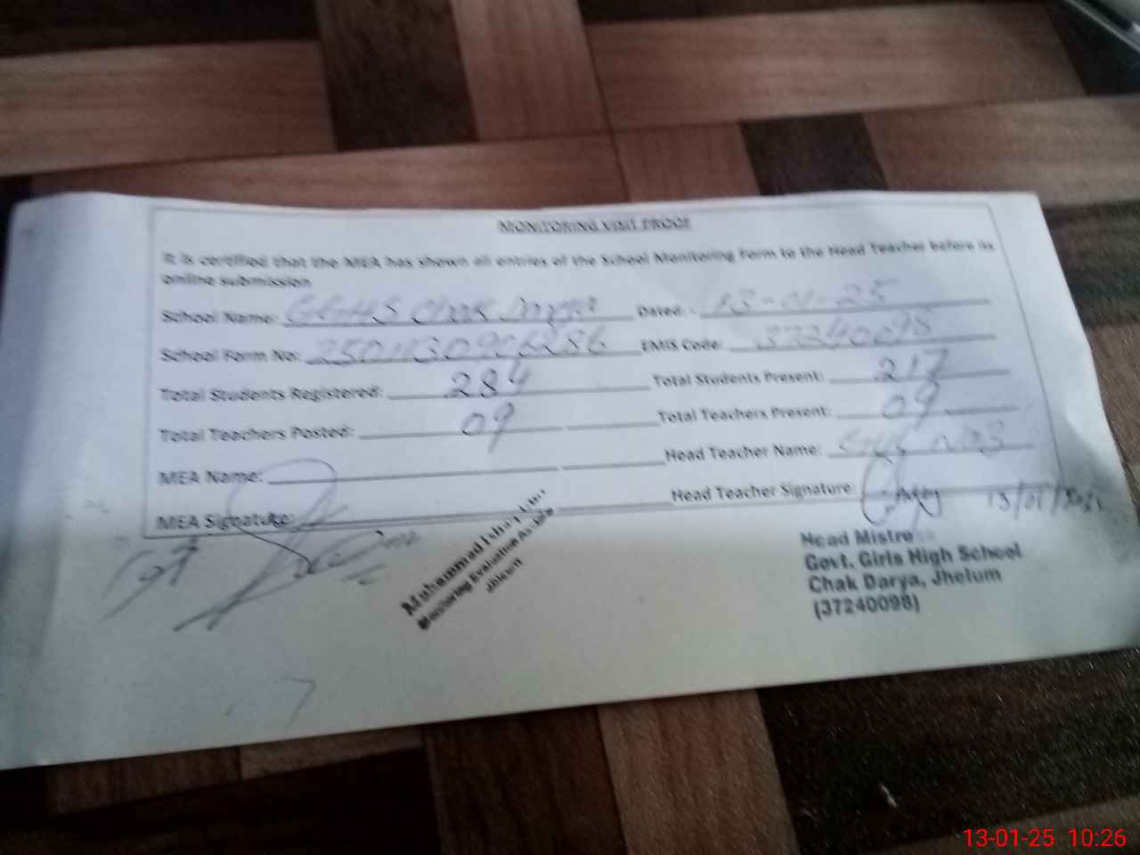 | Certified that this School was Inspected by the Undersigned MEA/DMO Today and the Information Stated Above is as Per Record. | |||||