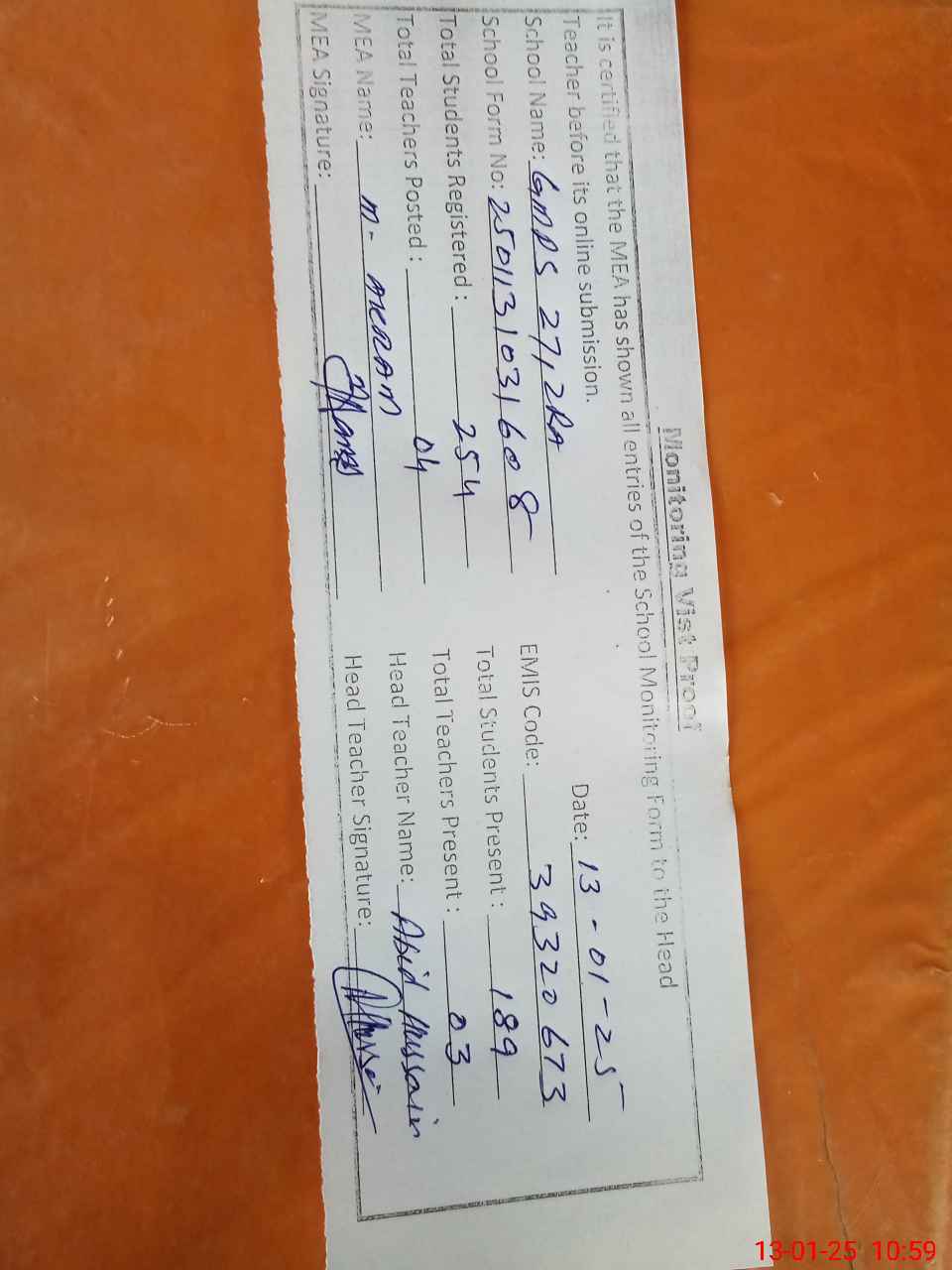 | Attendance Register | Head Teacher | MEA with School | Visit Proof |