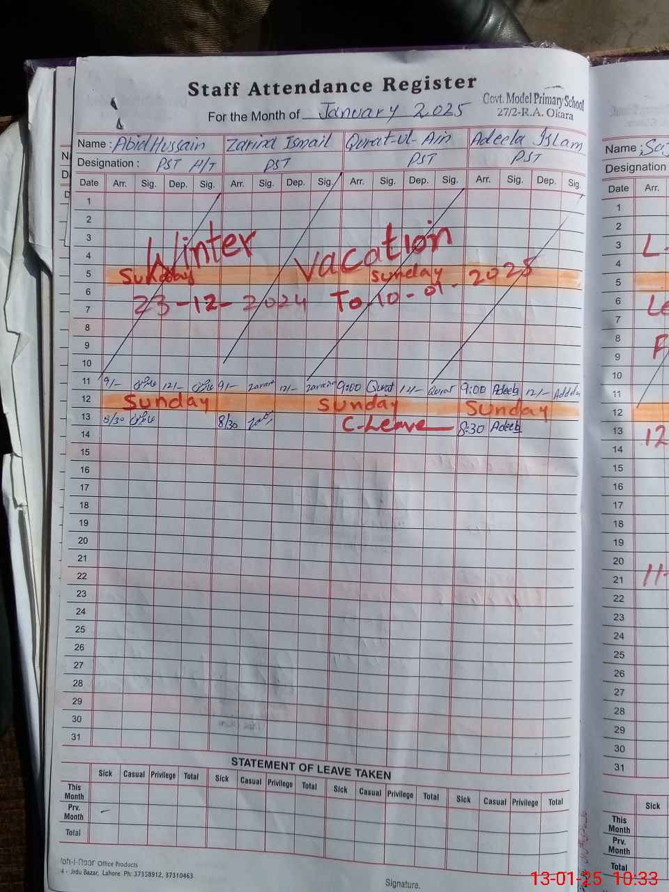 | CNIC | Full Name | Designation | R/C | Absence During Last Calender Month |