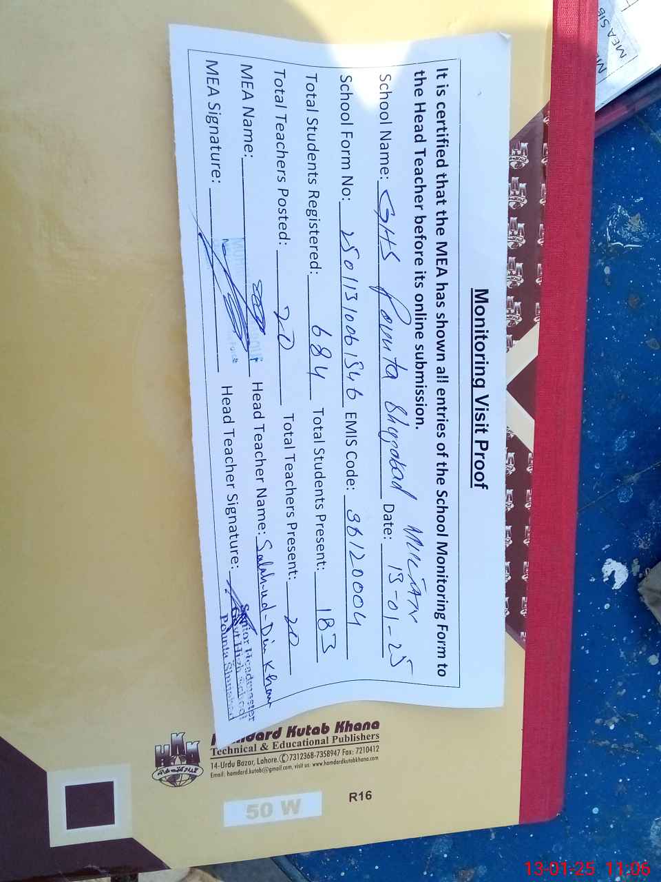 | Attendance Register | Head Teacher | MEA with School | Visit Proof |