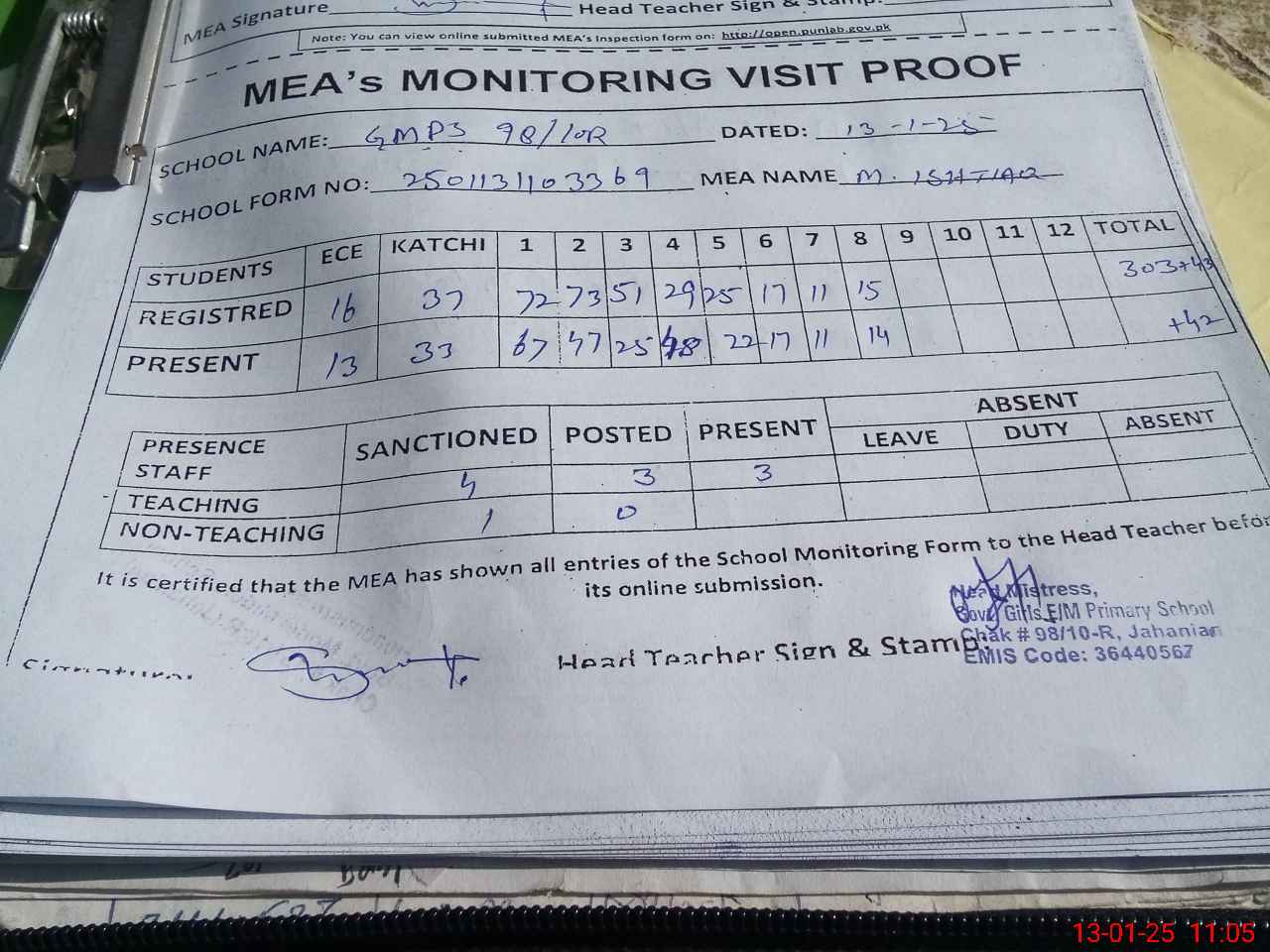 | Attendance Register | Head Teacher | MEA with School | Visit Proof |