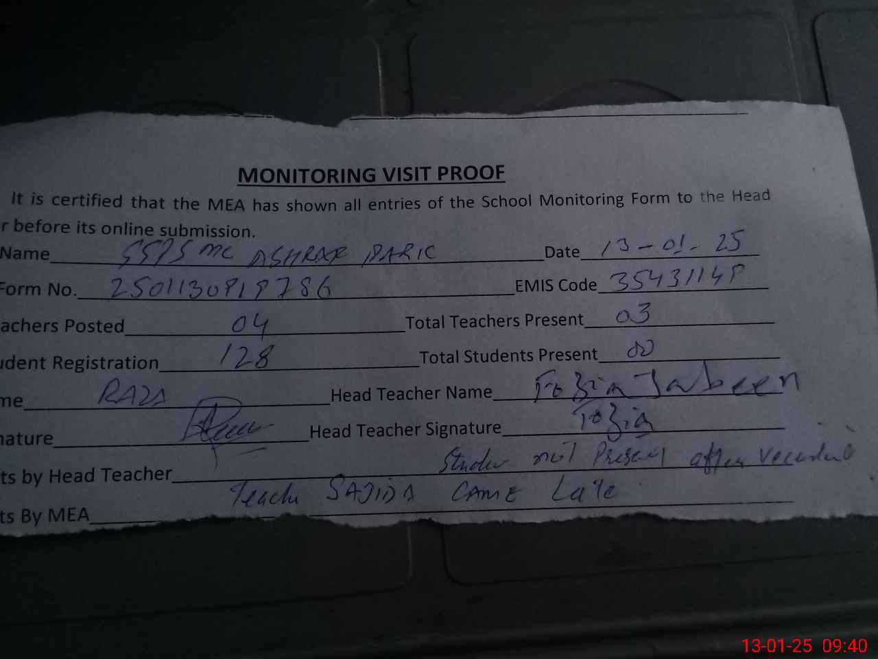 | Attendance Register | Head Teacher | MEA with School | Visit Proof |