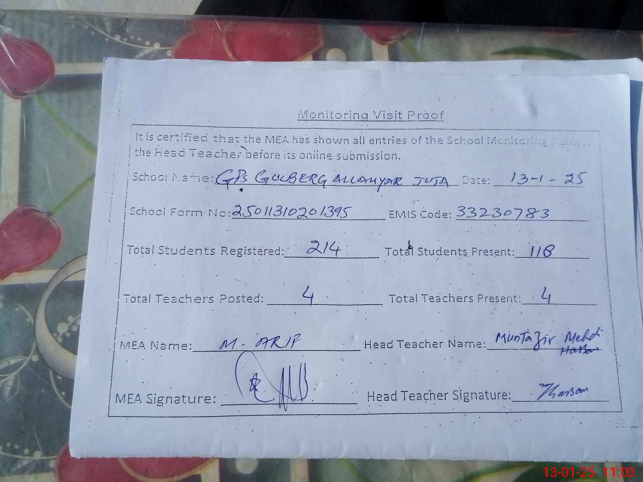 | Attendance Register | Head Teacher | MEA with School | Visit Proof |