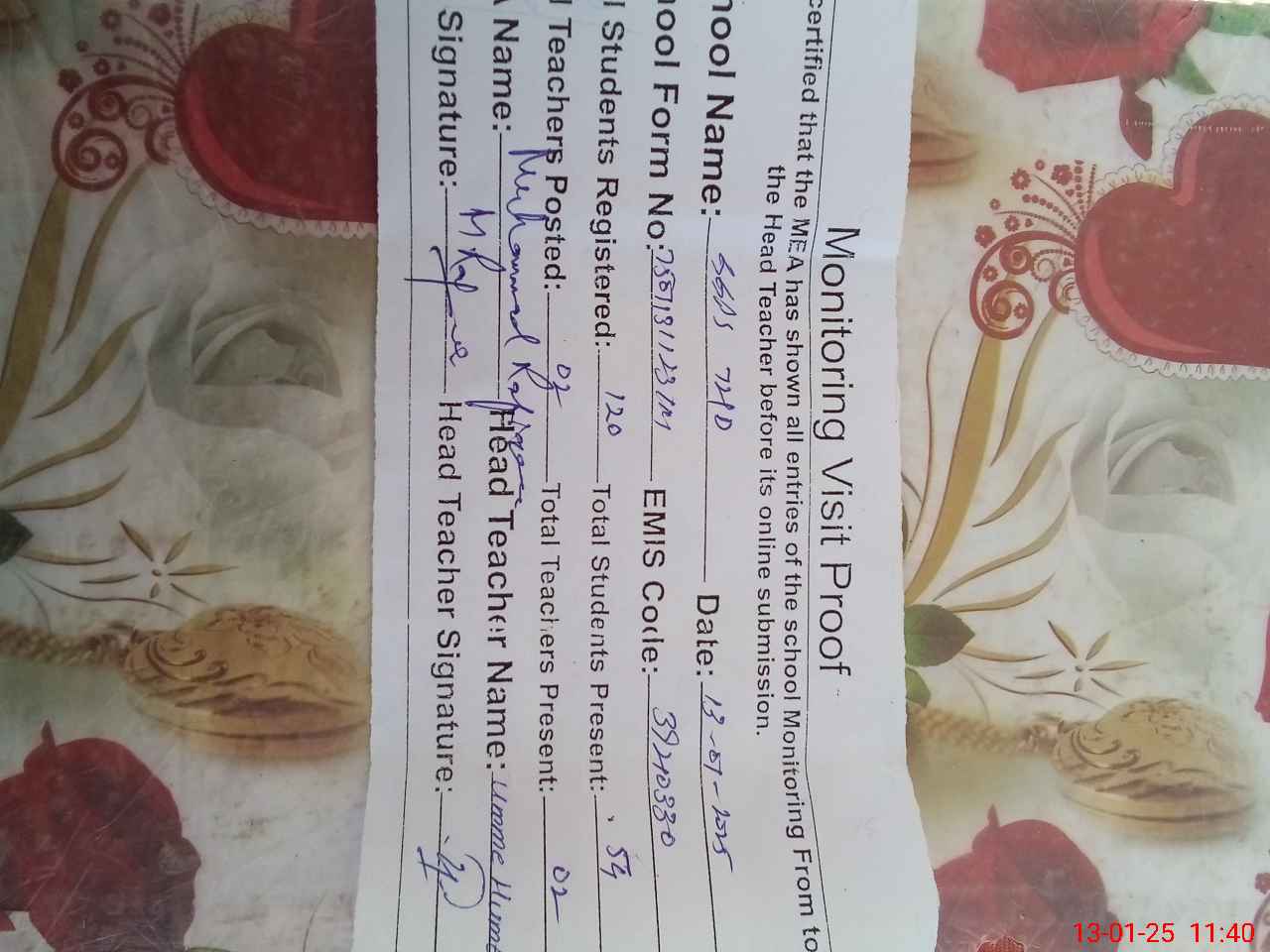 | Attendance Register | Head Teacher | MEA with School | Visit Proof |