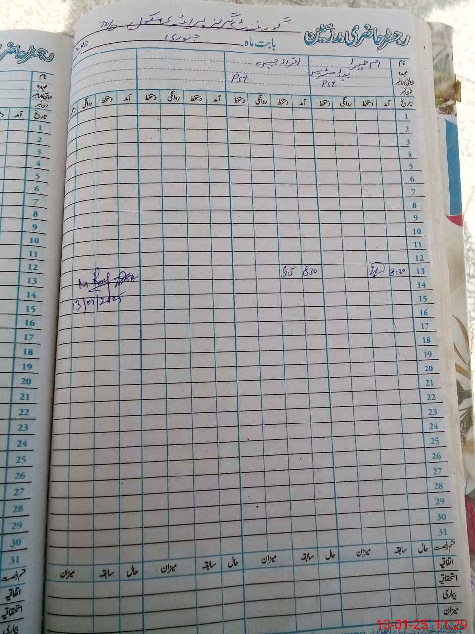 | CNIC | Full Name | Designation | R/C | Absence During Last Calender Month |
