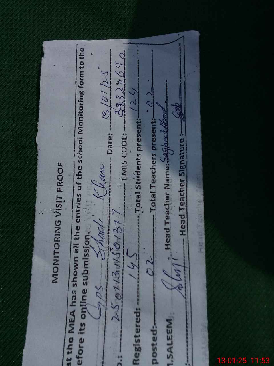 | Attendance Register | Head Teacher | MEA with School | Visit Proof |