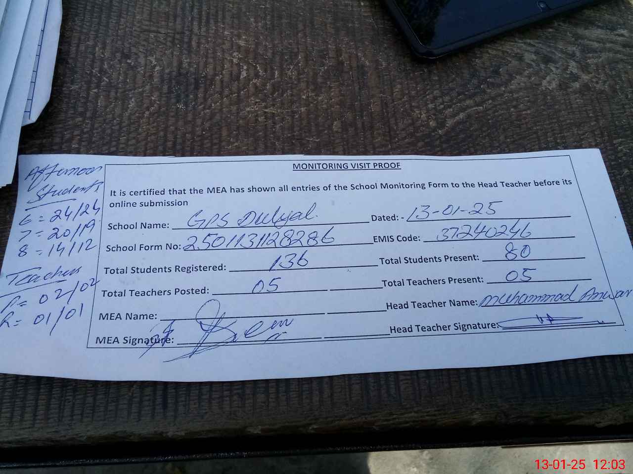| Attendance Register | Head Teacher | MEA with School | Visit Proof |