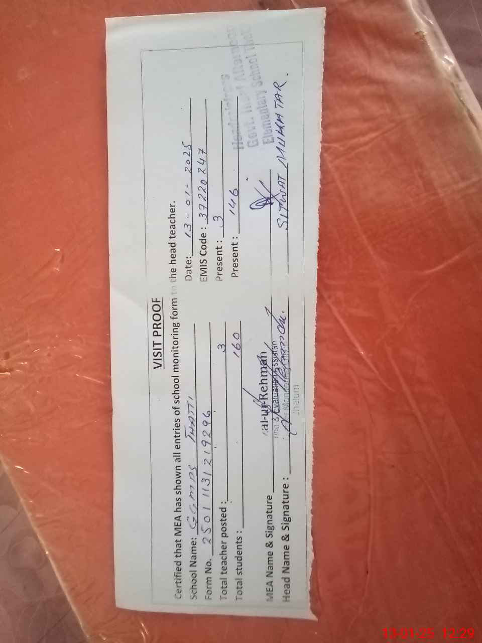 | Attendance Register | Head Teacher | MEA with School | Visit Proof |
