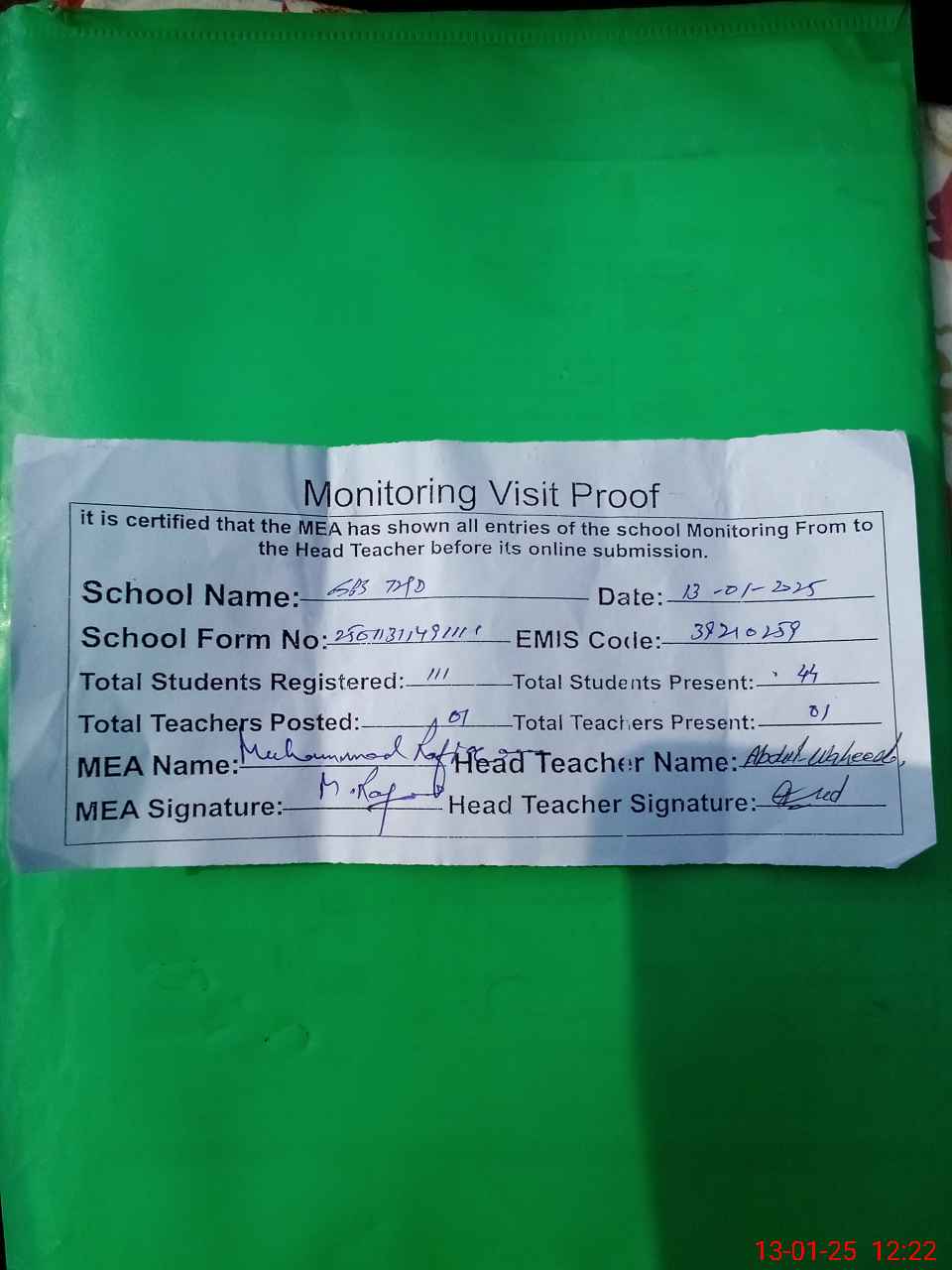 | Certified that this School was Inspected by the Undersigned MEA/DMO Today and the Information Stated Above is as Per Record. | |||||
