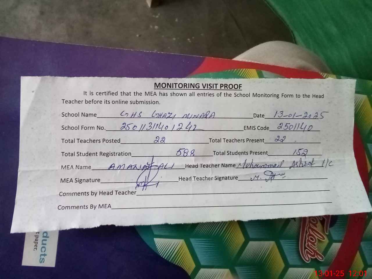 | Attendance Register | Head Teacher | MEA with School | Visit Proof |