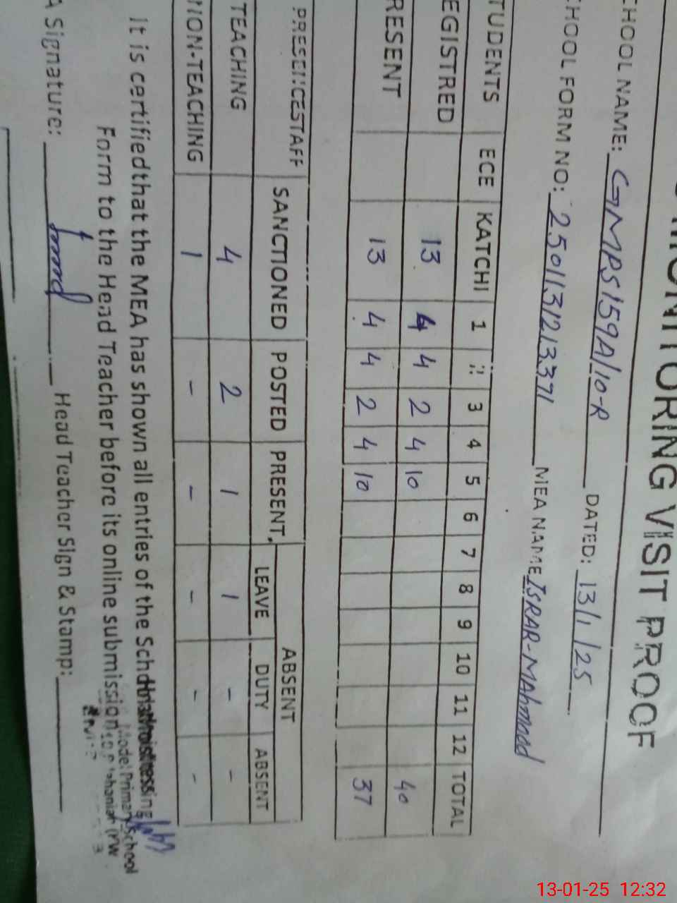 | Attendance Register | Head Teacher | MEA with School | Visit Proof |