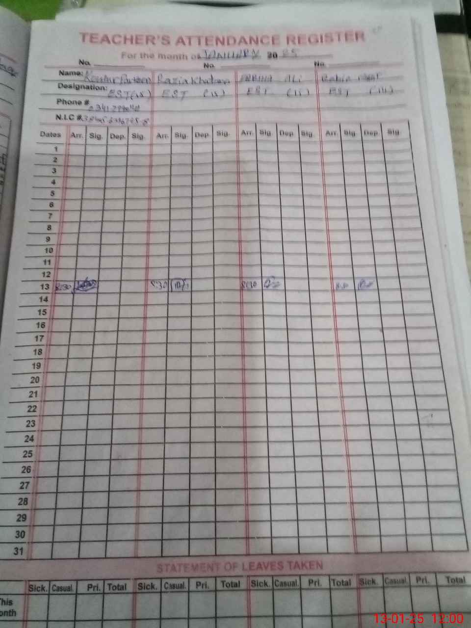 | CNIC | Full Name | Designation | R/C | Absence During Last Calender Month |
