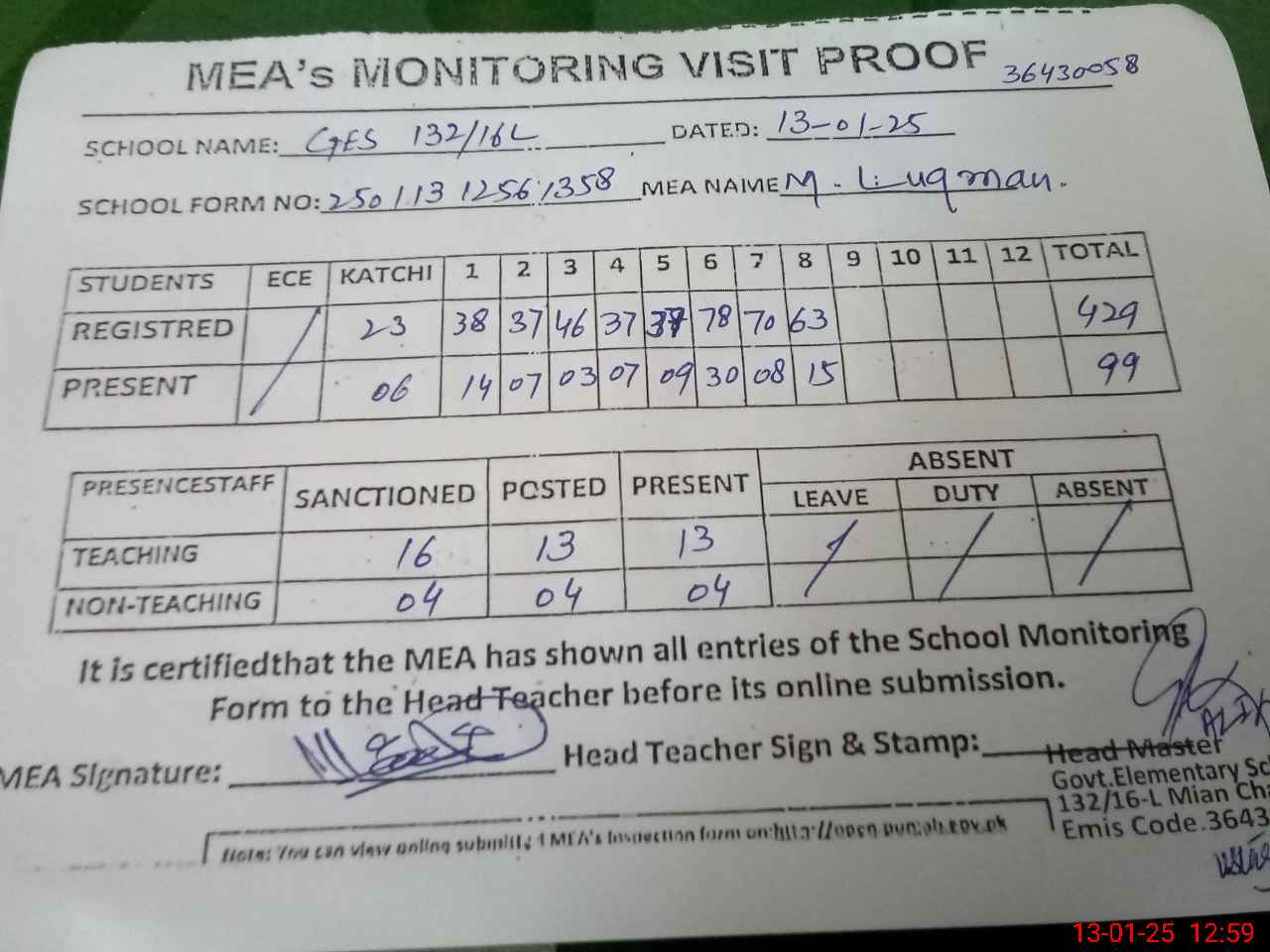 | EMIS Code: 36430058 | Name of School: GES 132/16-L, MIAN CHANNU | |||