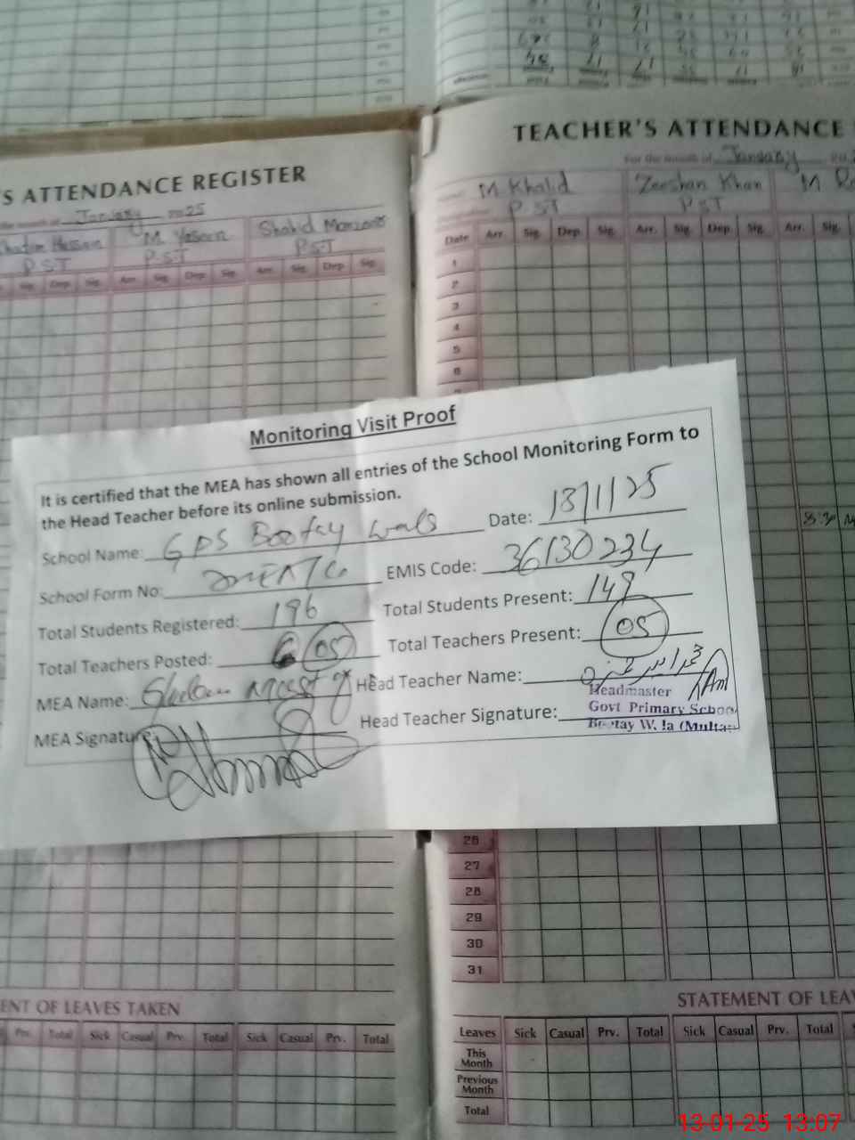 | Attendance Register | Head Teacher | MEA with School | Visit Proof |