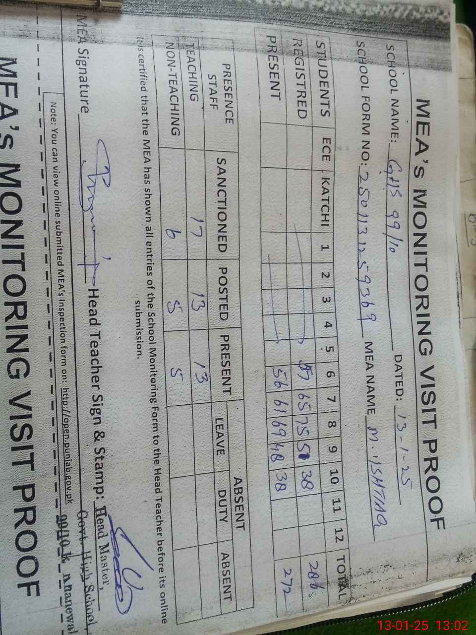 | Attendance Register | Head Teacher | MEA with School | Visit Proof |