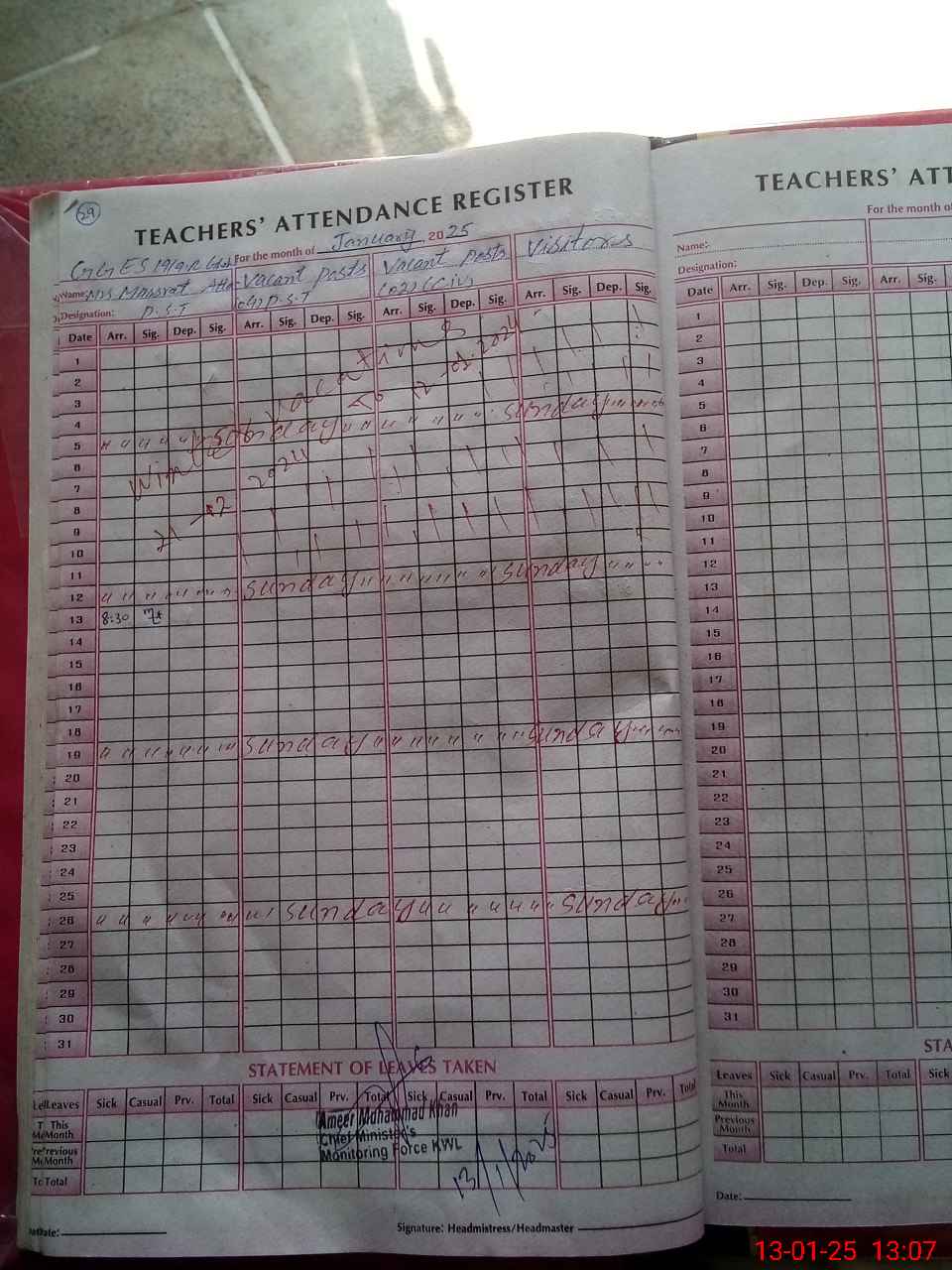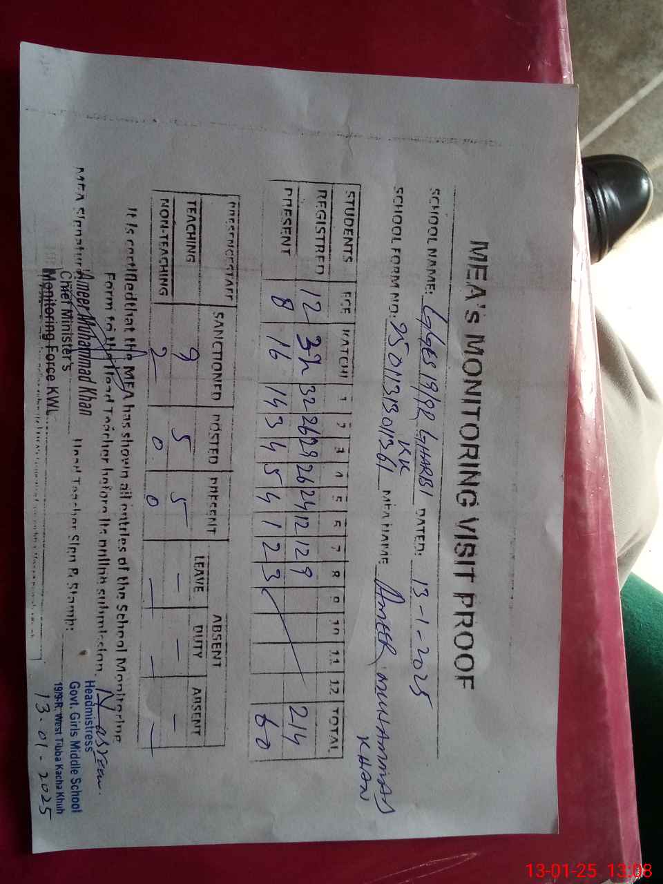 | Attendance Register | Head Teacher | MEA with School | Visit Proof |