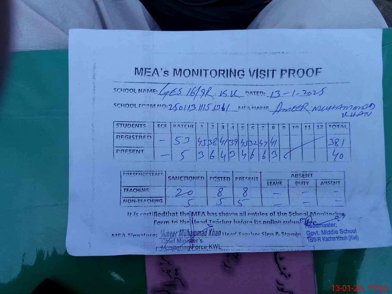 | Remarks (Use Separate Page if Required): Allah students were playing during the visit All teachers were sun bathing during the MEA visit not attending any class for study due to shortage of students attandce | |||||