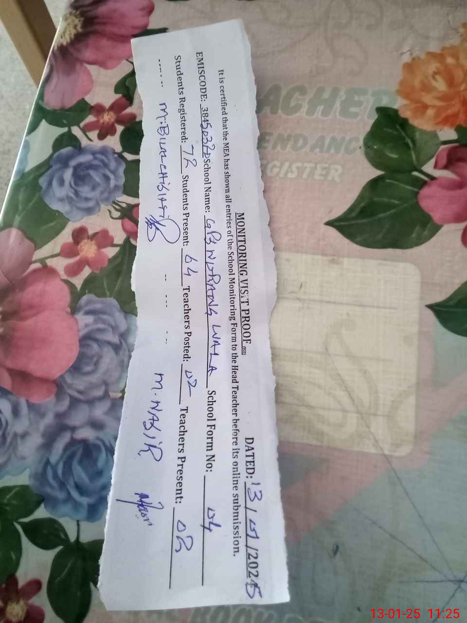 | Attendance Register | Head Teacher | MEA with School | Visit Proof |