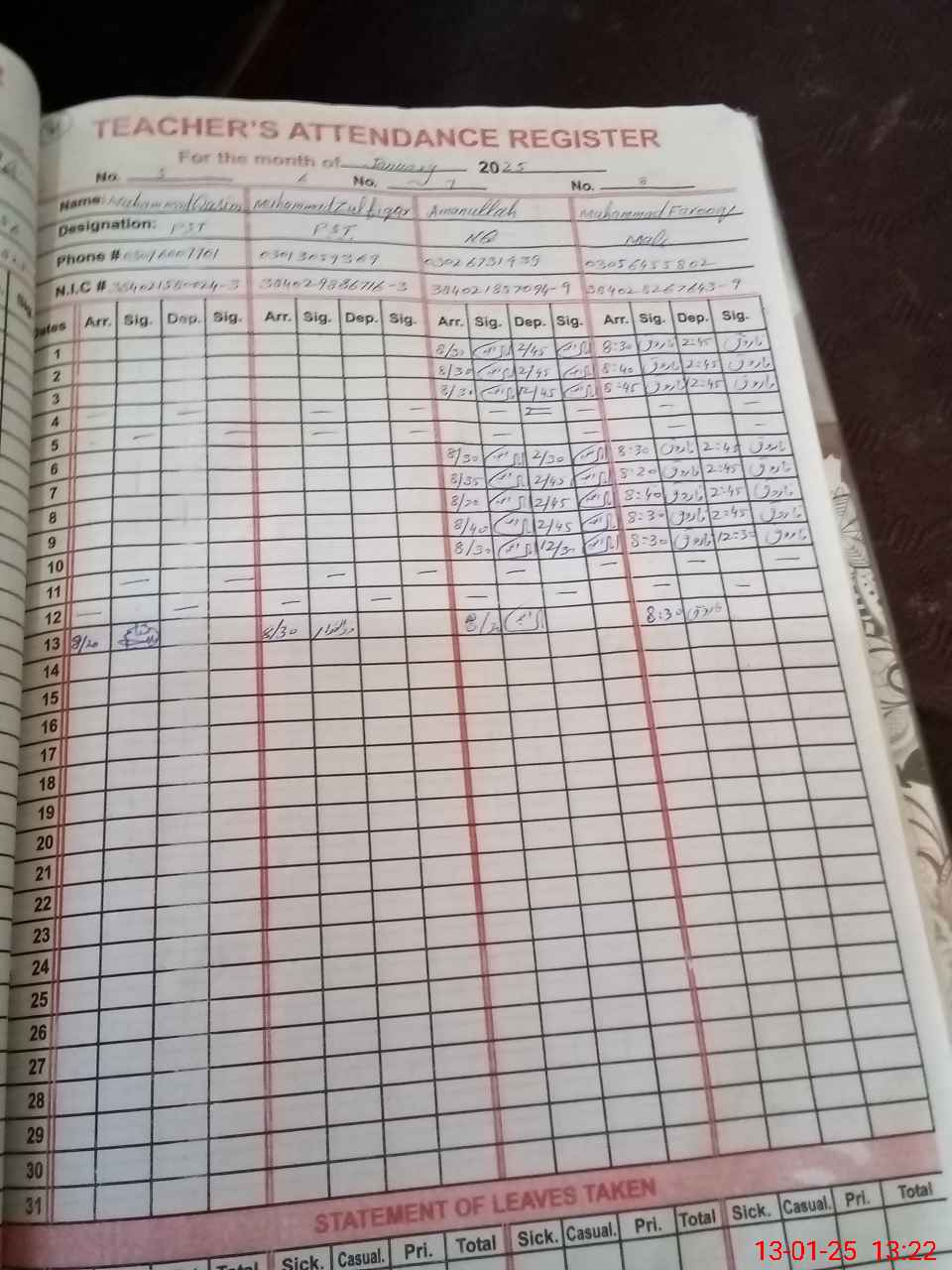 | CNIC | Full Name | Designation | R/C | Absence during last cal. month |
