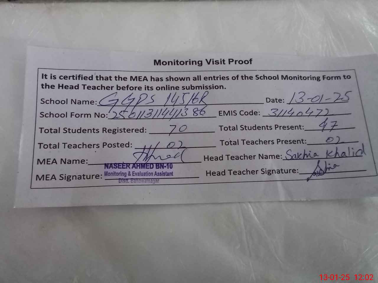 | Attendance Register | Head Teacher | MEA with School | Visit Proof |