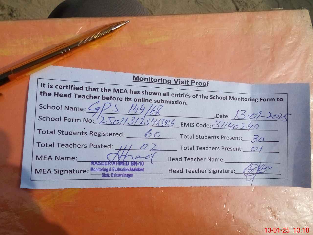| EMIS Code: 31140240 | Name of School: GPS CHAK NO. 144/6-R | |||
