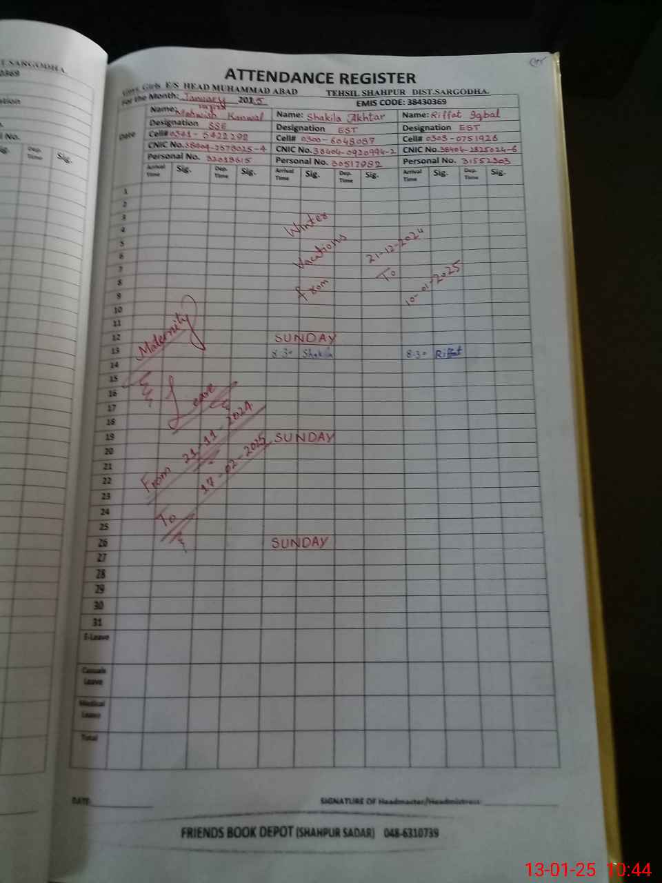 | CNIC | Full Name | Designation | R/C | Absence During Last Calender Month |