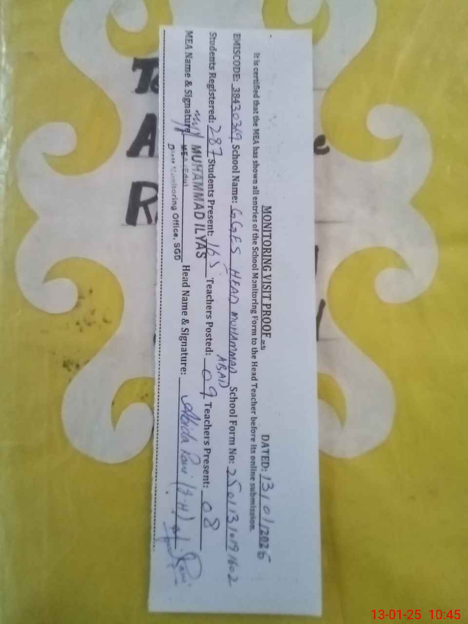 | Certified that this School was Inspected by the Undersigned MEA/DMO Today and the Information Stated Above is as Per Record. | |||||