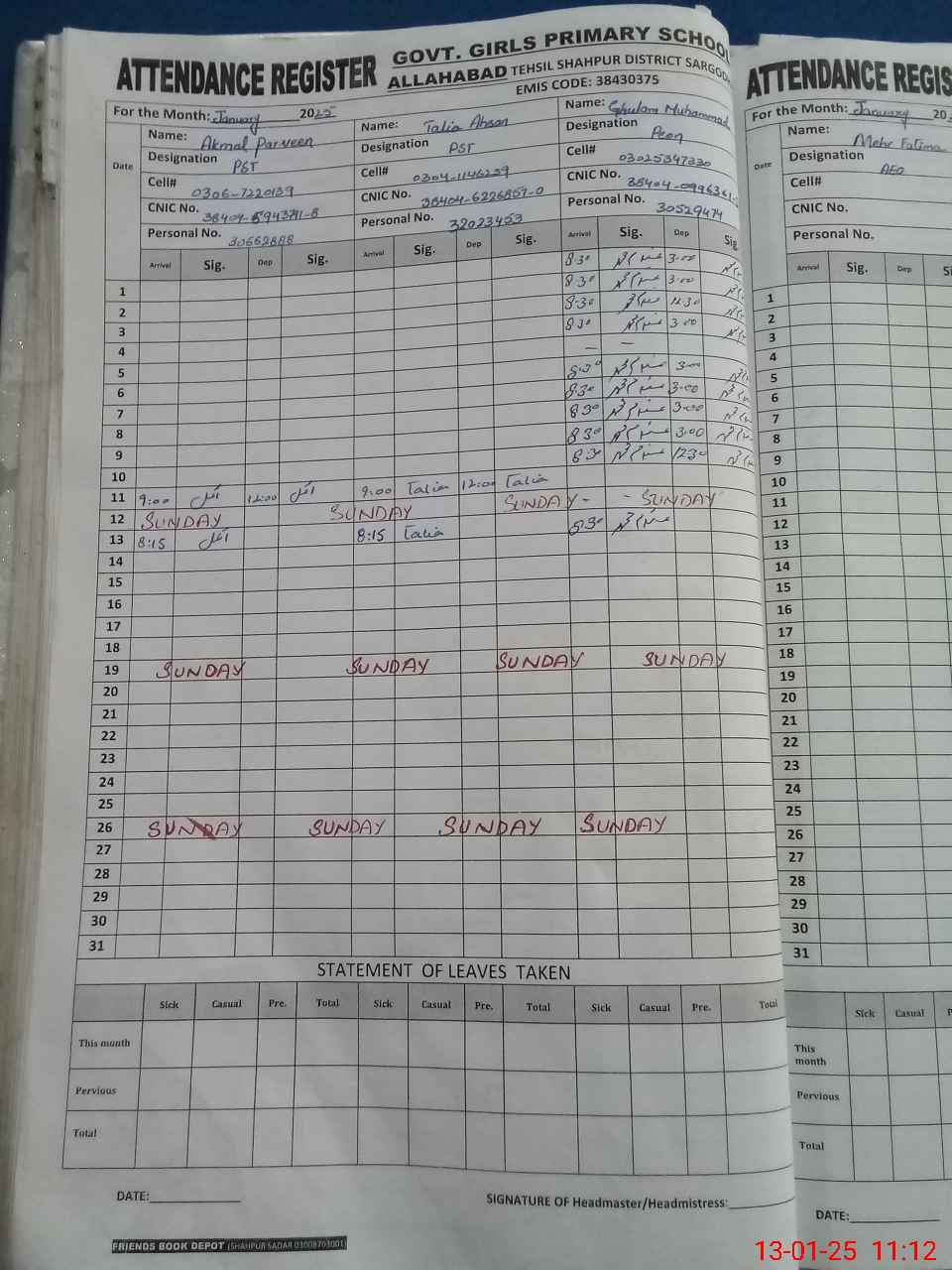 | Name: AK**** PA**** Designation: (School Headmaster's/Headmistress's) PST Phone/Cell Number: 03**** |