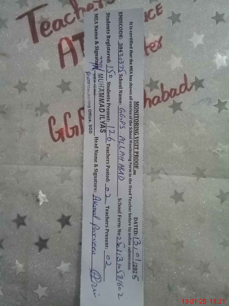 | Attendance Register | Head Teacher | MEA with School | Visit Proof |