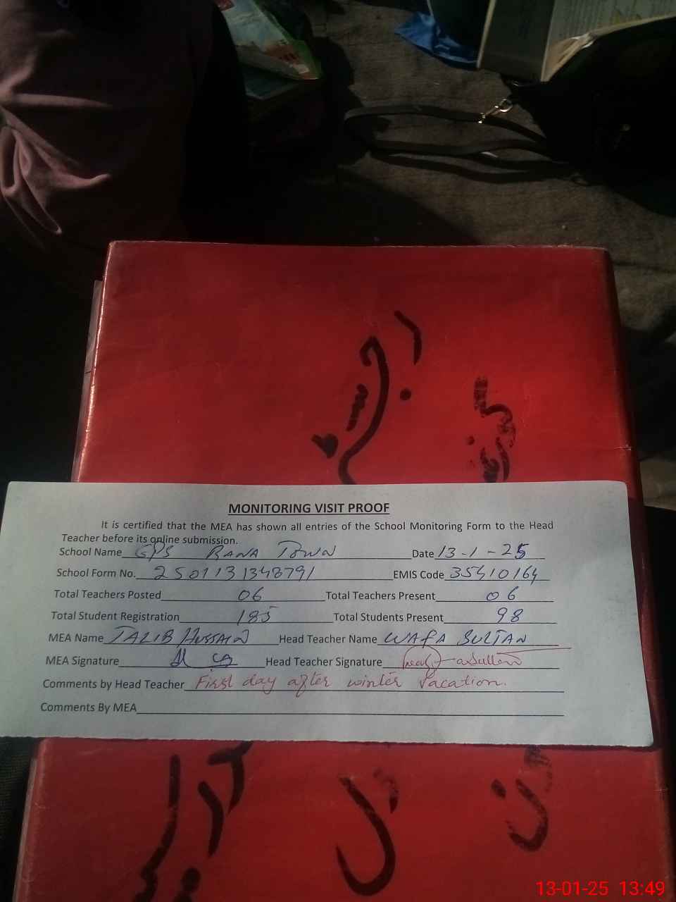 | Attendance Register | Head Teacher | MEA with School | Visit Proof |