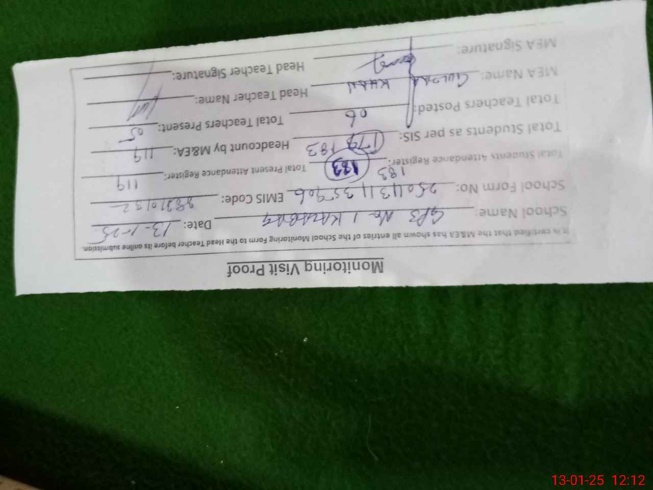 | Attendance Register | Head Teacher | MEA with School | Visit Proof |