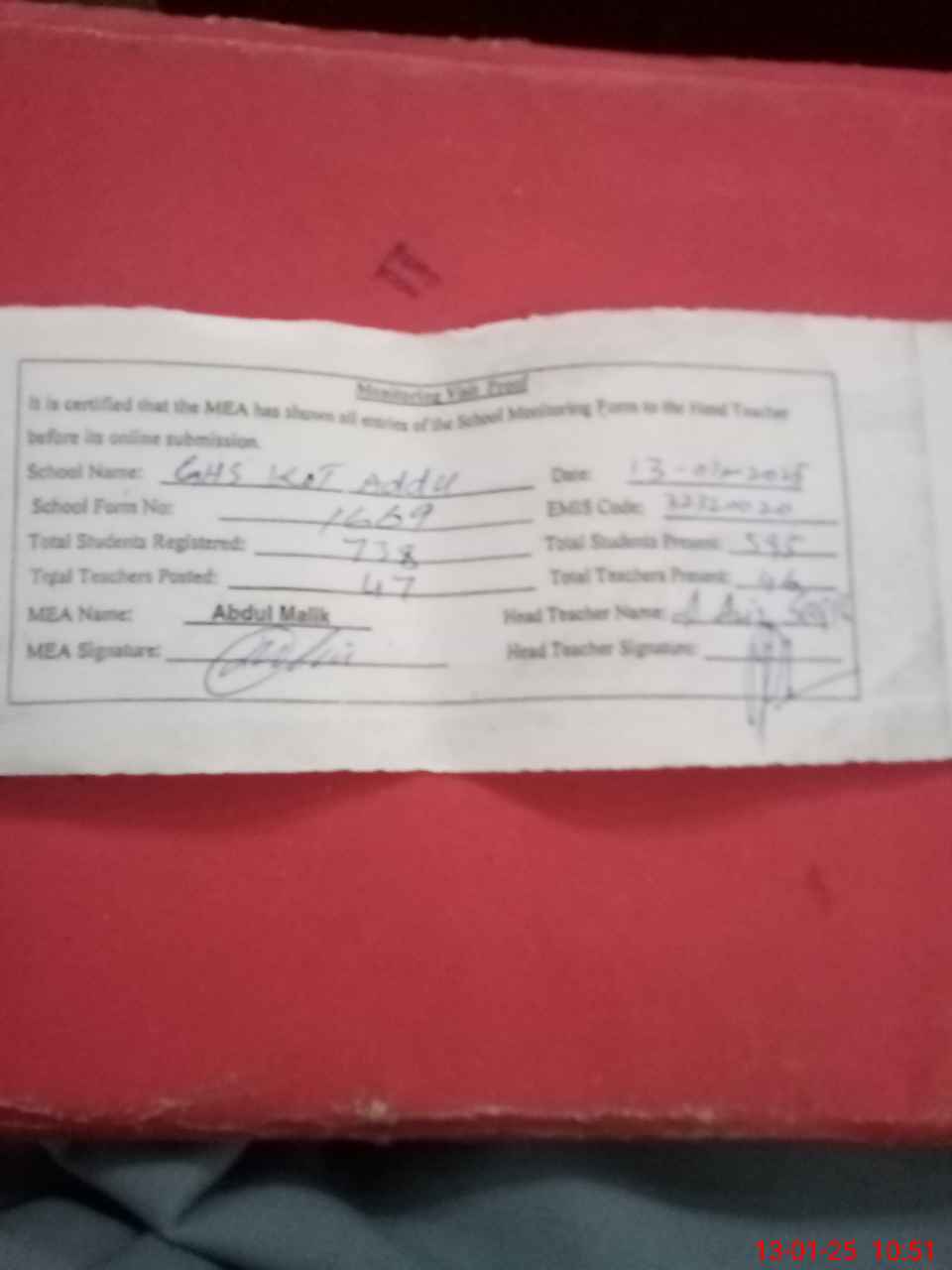 | Attendance Register | Head Teacher | MEA with School | Visit Proof |