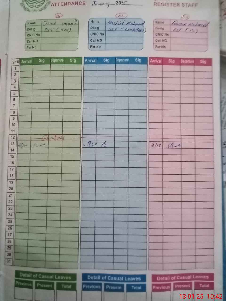 | CNIC | Full Name | Designation | R/C | Absence during last cal. month |
