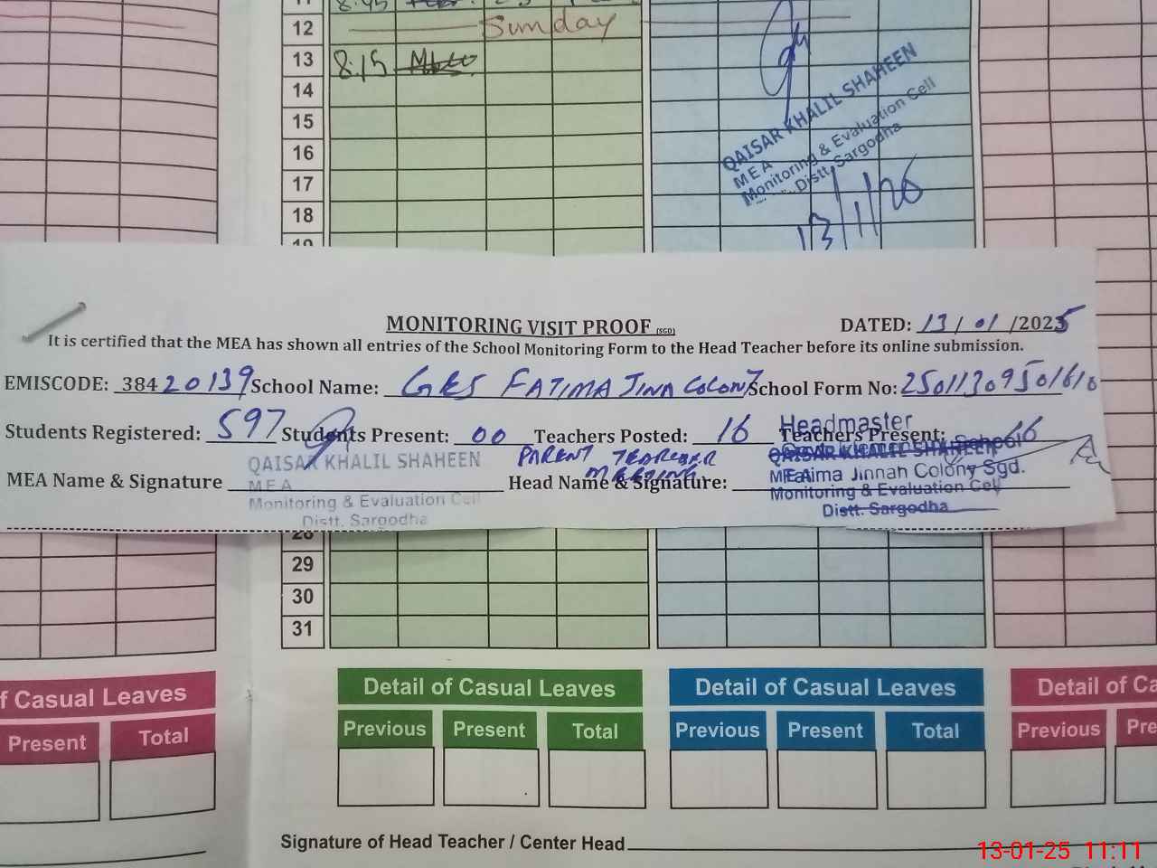 | Attendance Register | Head Teacher | MEA with School | Visit Proof |