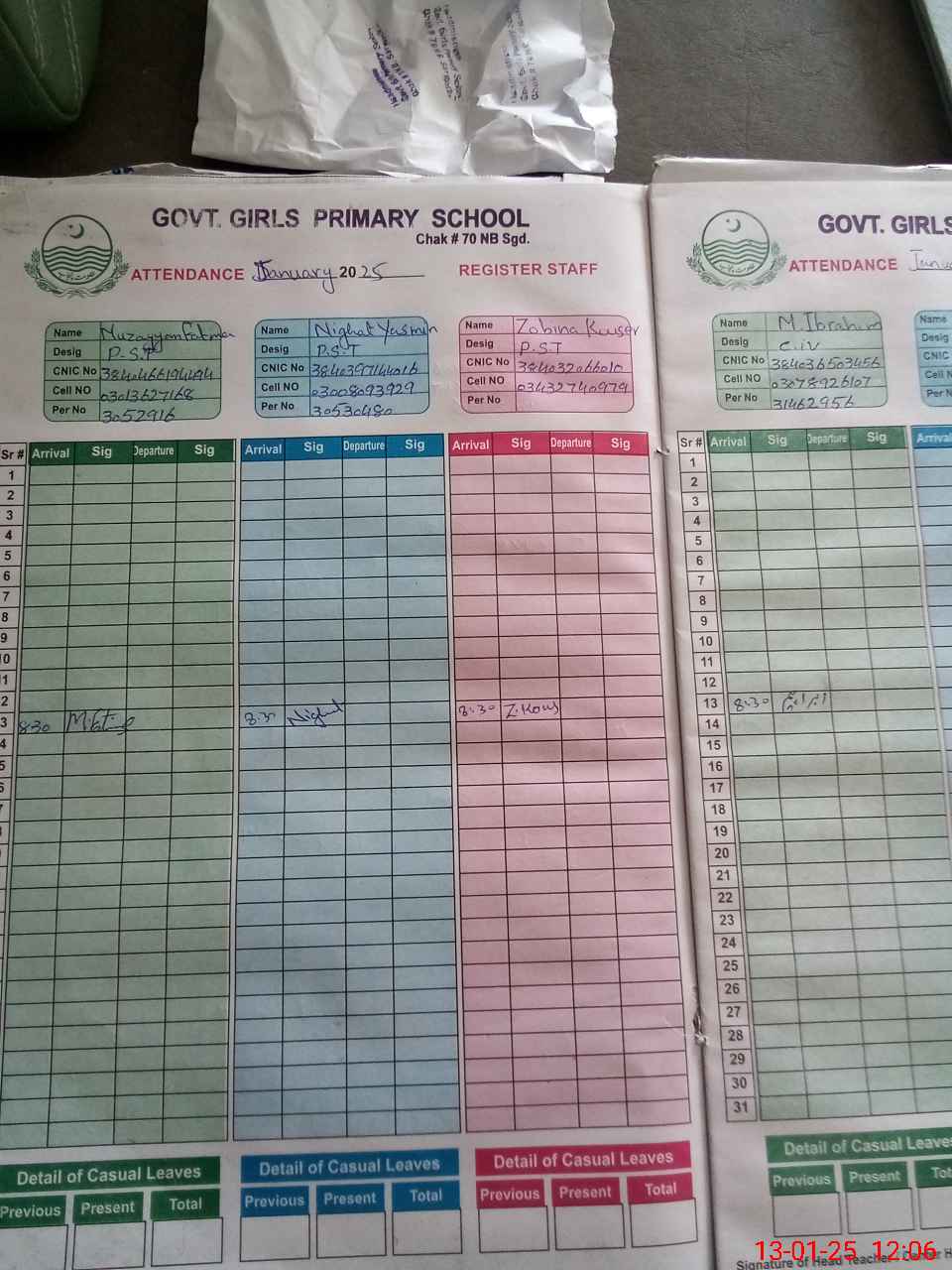 | CNIC | Full Name | Designation | R/C | Absence During Last Calender Month |
