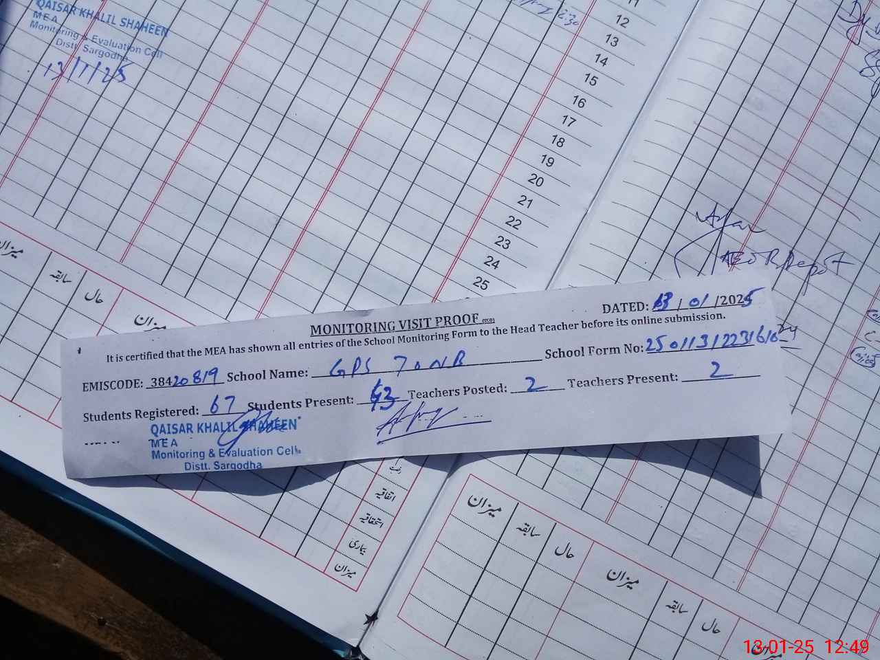 | Attendance Register | Head Teacher | MEA with School | Visit Proof |